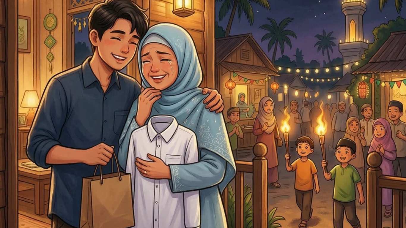 Ibu langsung terdiam, lalu matanya berkaca-kaca. “Arga… kamu beli ini?” Arga mengangguk. “Dari tabungan Arga.” Ibunya tersenyum haru, lalu meraih sebuah kantong plastik di sampingnya. “Ibu juga punya sesuatu,” ucapnya lembut. Arga membuka kantong itu dan terdiam. Sebuah kemeja putih baru terlipat rapi di dalamnya. “Ibu nabung sedikit-sedikit… supaya Arga tetap punya baju Lebaran,” katanya dengan suara bergetar. Ayah yang sejak tadi memperhatikan hanya menggeleng pelan sambil tersenyum hangat. “Ternyata kalian berdua sama saja,” ujarnya.