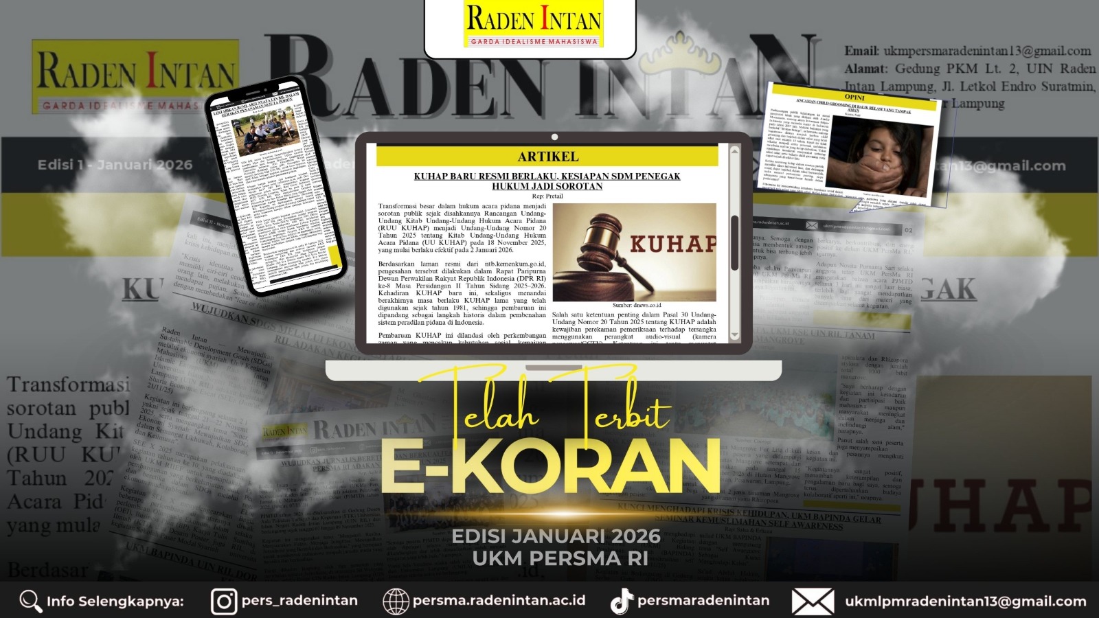 Dalam perkembangan teknologi yang semakin canggih, membuat koran dapat diakses dimana saja dan kapan saja melalui internet. Maka dengan itu, UKM PersMa Raden Intan dengan bangga kembali menerbitkan “𝗘-𝗞𝗼𝗿𝗮𝗻 𝗘𝗱𝗶𝘀𝗶 𝗜” tahun 2026.